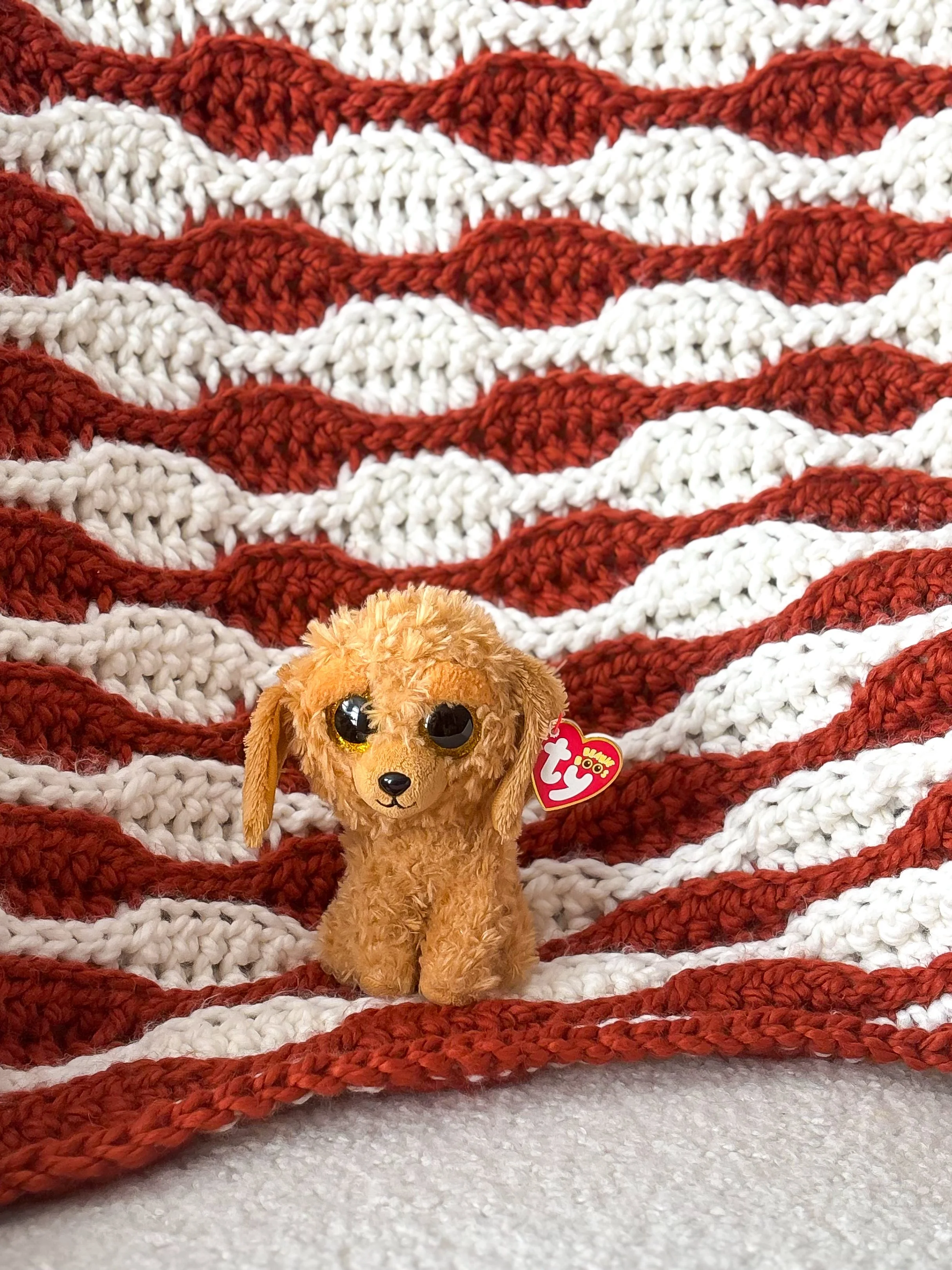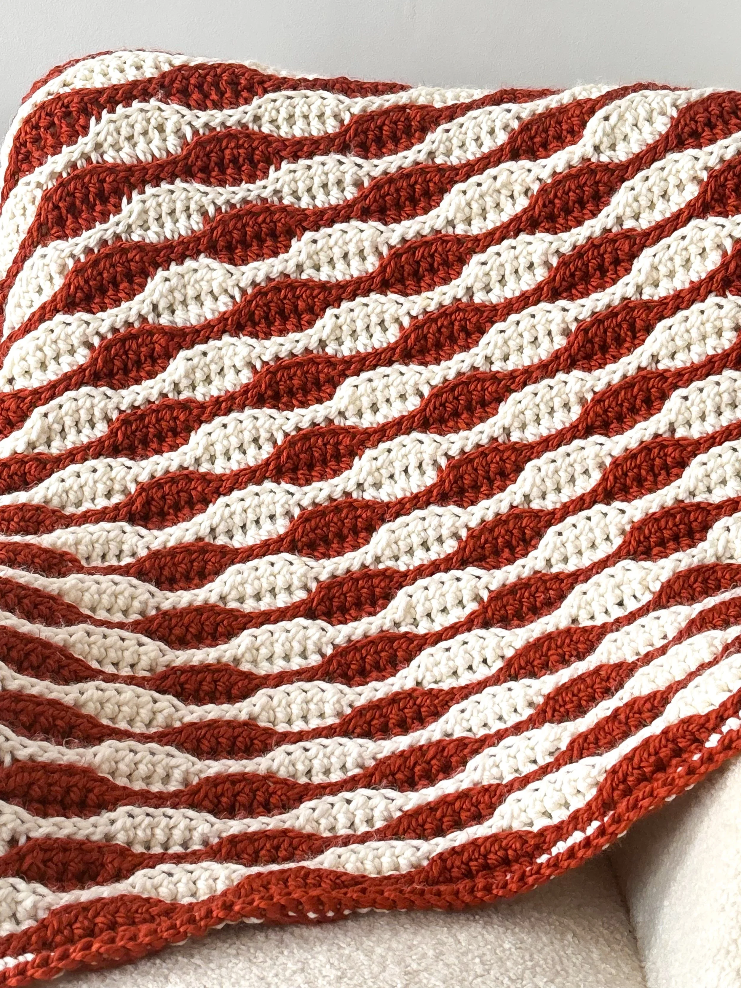 This blanket is worked in rows from the bottom up, repeating four rows in order to create the wave look and turning at the end of each row.