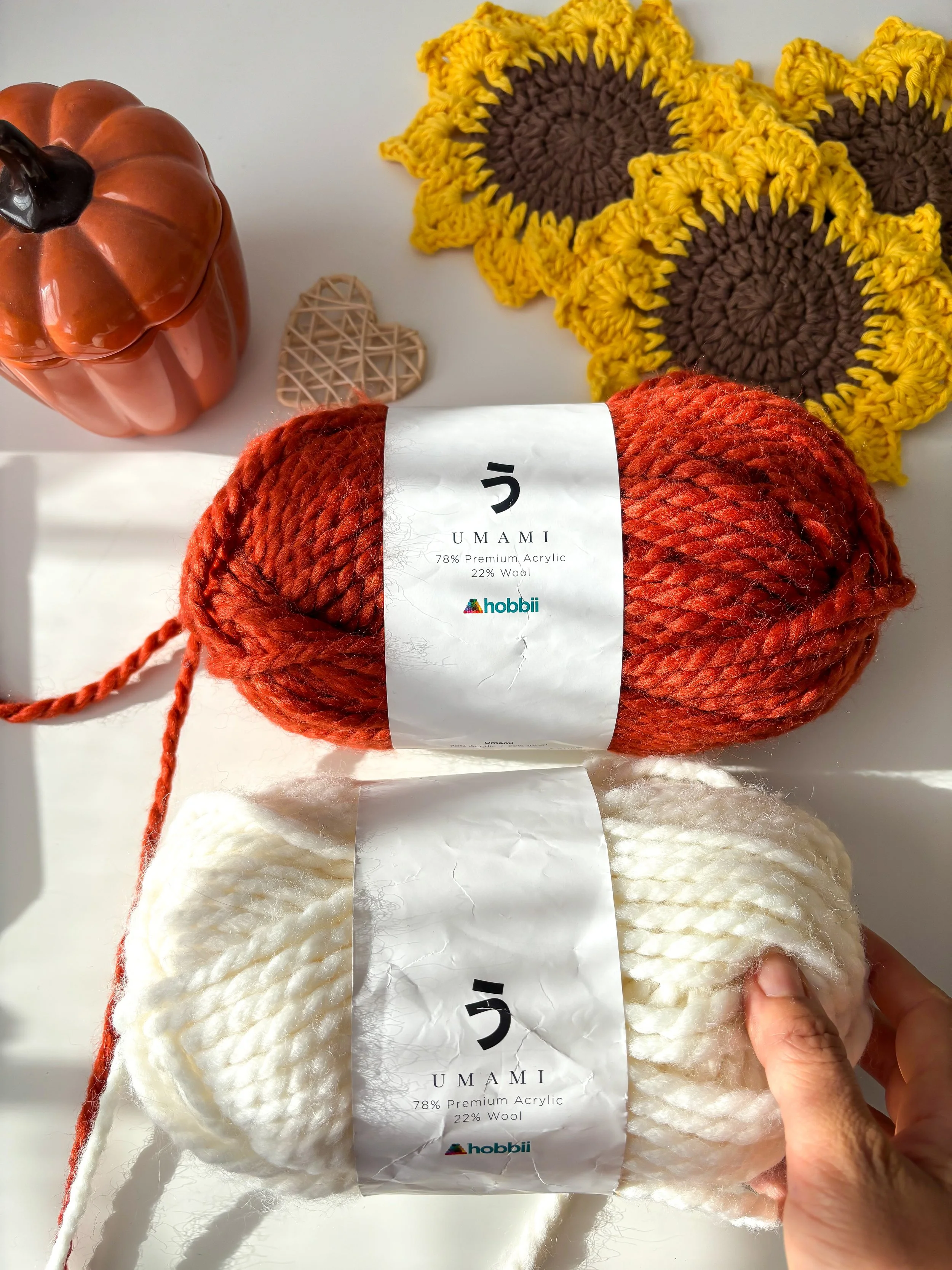 The yarn I used for my Waves of Autumn Crochet Throw is Umami by Hobbii, a wonderfully soft and squishy yarn that works up beautifully for this textured wave stitch. When substituting yarn, it’s important to choose one with a similar weight to achieve the intended size and drape. Umami sits comfortably in the super bulky or chunky weight category, with a plush, cozy feel. If you opt for a slightly lighter worsted-weight yarn, your blanket may turn out a bit smaller, which can give your project its own unique look and charm.