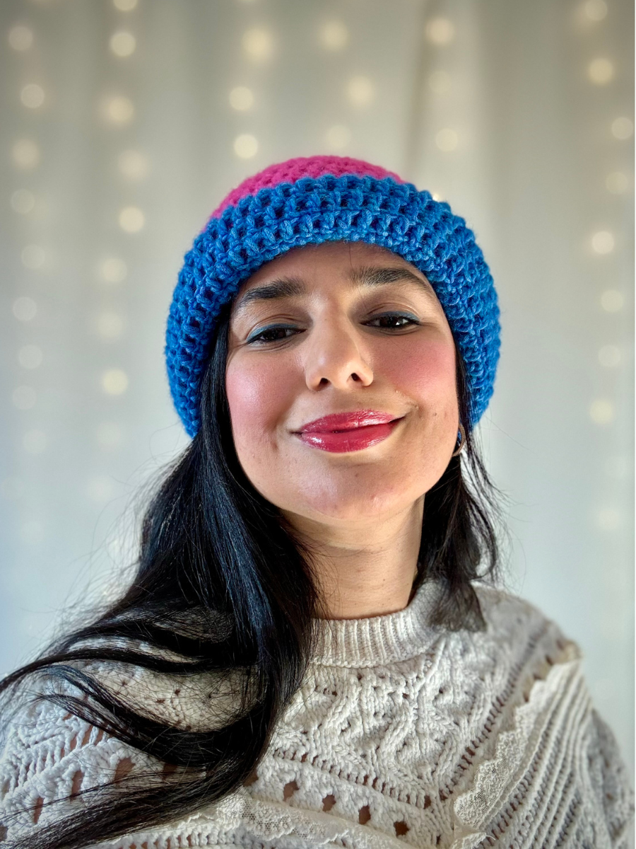 One of the highlights of this pattern is its versatility. The two-tone design lets you mix and match colors to create your own unique look. Use neutral tones for a classic vibe or go bold with bright, contrasting colors. The rolled brim adds a modern, playful twist that pairs beautifully with the cozy double-layered texture.