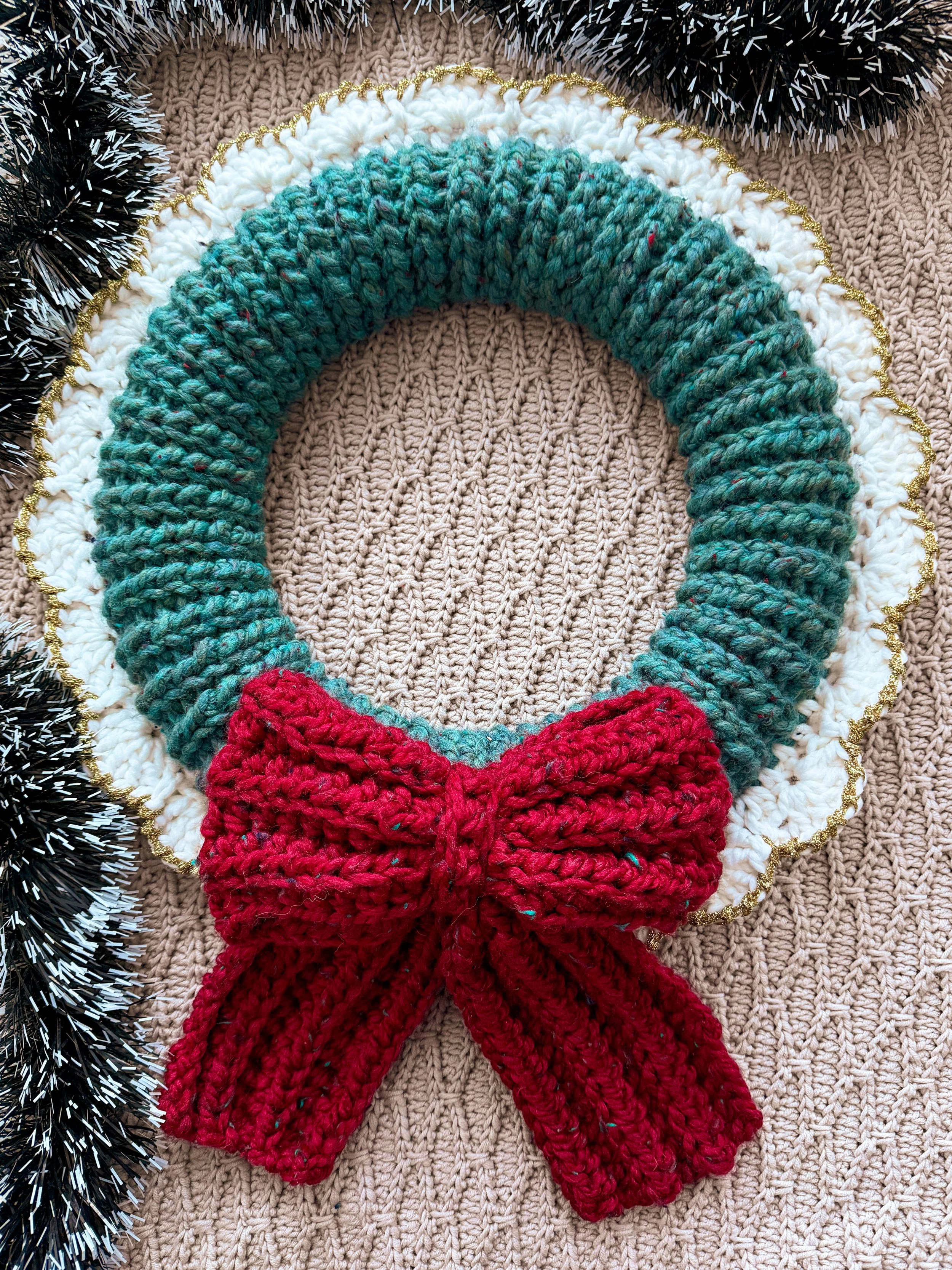 If you’re looking for a quick, cozy, and festive crochet project, you’re in the right place! This Jingle Bells Wreath turns two simple rectangles into a beautiful holiday decoration with a bold bow and a pretty scalloped edge. It works up fast using super bulky yarn and a combination of simple stitches that create a knit-look texture, giving your crochet a polished, elevated finish without any added difficulty.