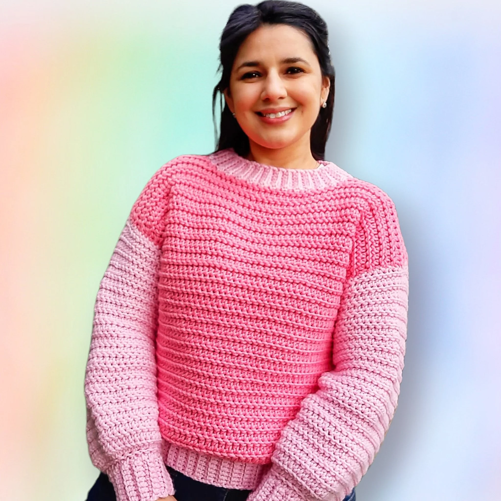I've always admired chunky knitted sweaters, so I decided to create my own version using crochet! I was so fortunate to receive this beautiful chunky yarn, but I quickly realized I didn’t have enough to make a full sweater. With only three balls of light pink and three balls of fuchsia, I had to get creative. After experimenting with various stitch samples to ensure I had enough yarn, I finally discovered the perfect knit-look stitch pattern. It was exactly what I needed to achieve the look I had envisioned for my sweater!