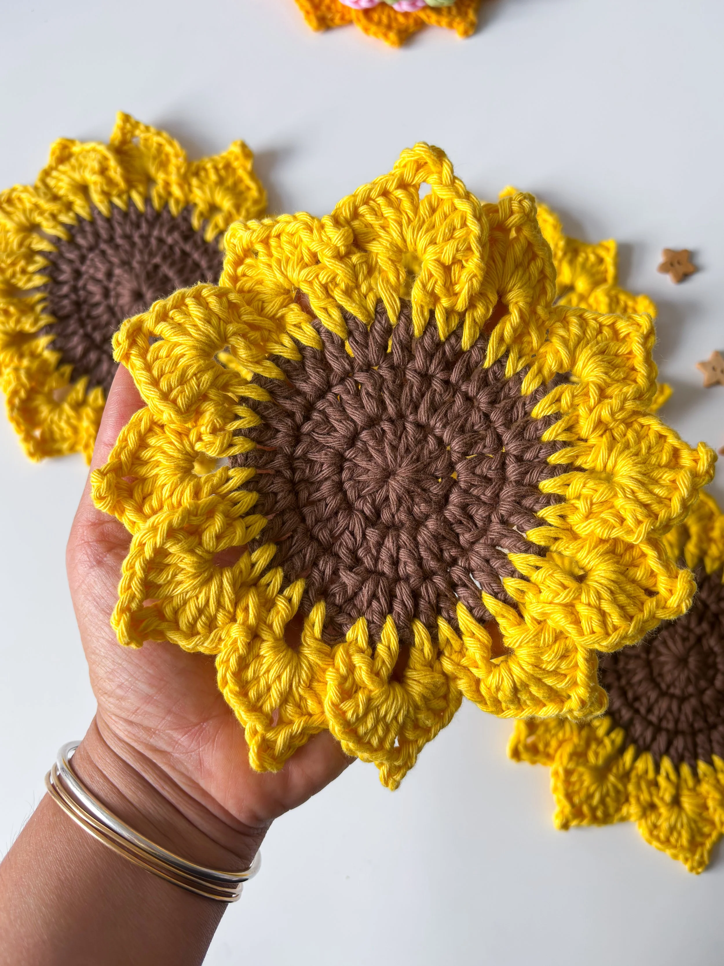 This is an easy crochet pattern making it perfect and suitable for beginners who want to practice crocheting in the round and learn new stitches like the PICOT stitch for the border of the sunflowers.
