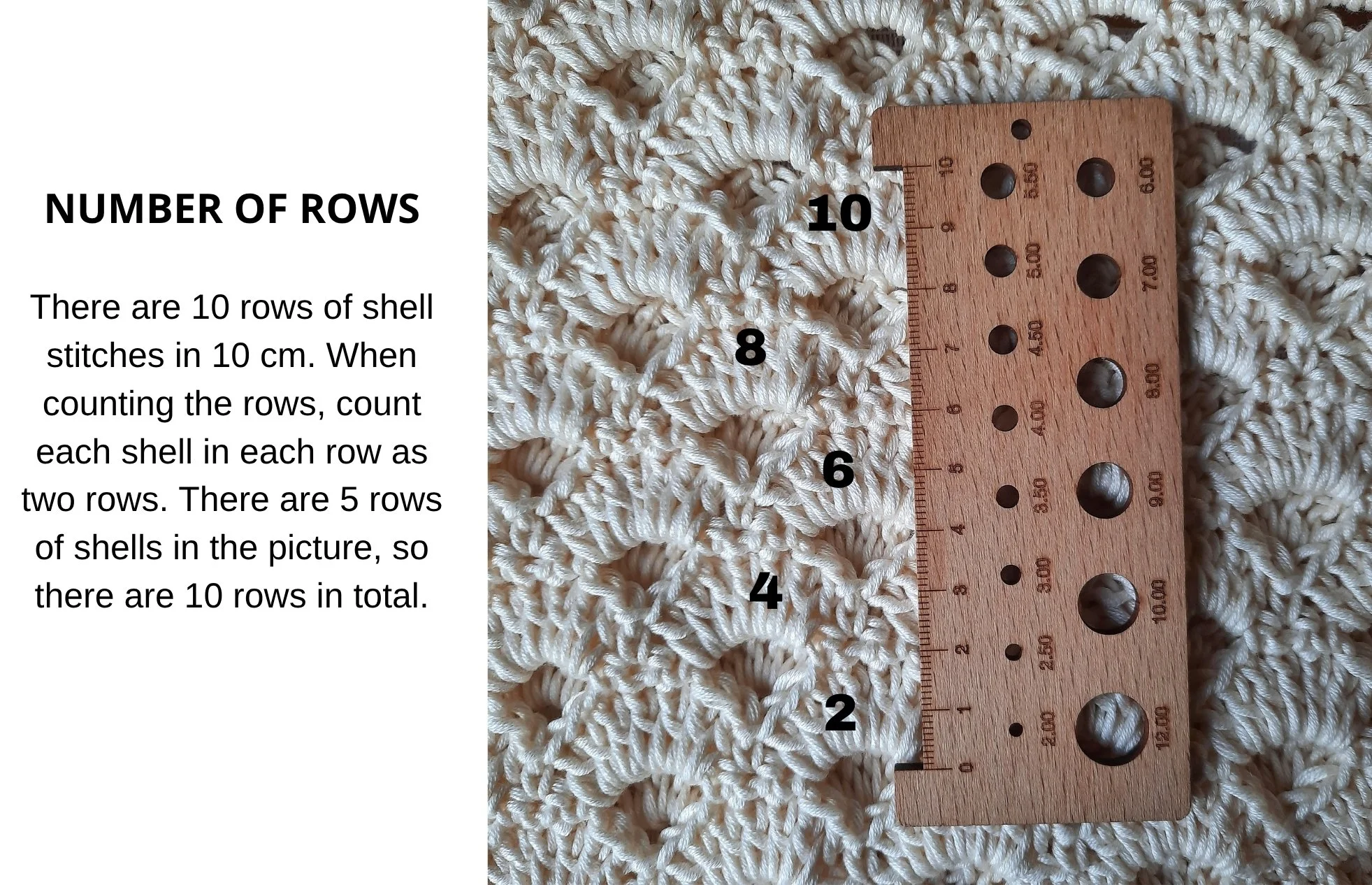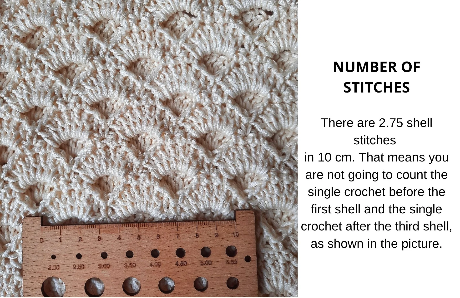 2.75 shell groups x 10 rows = 10 cm x 10cm (See picture below)
