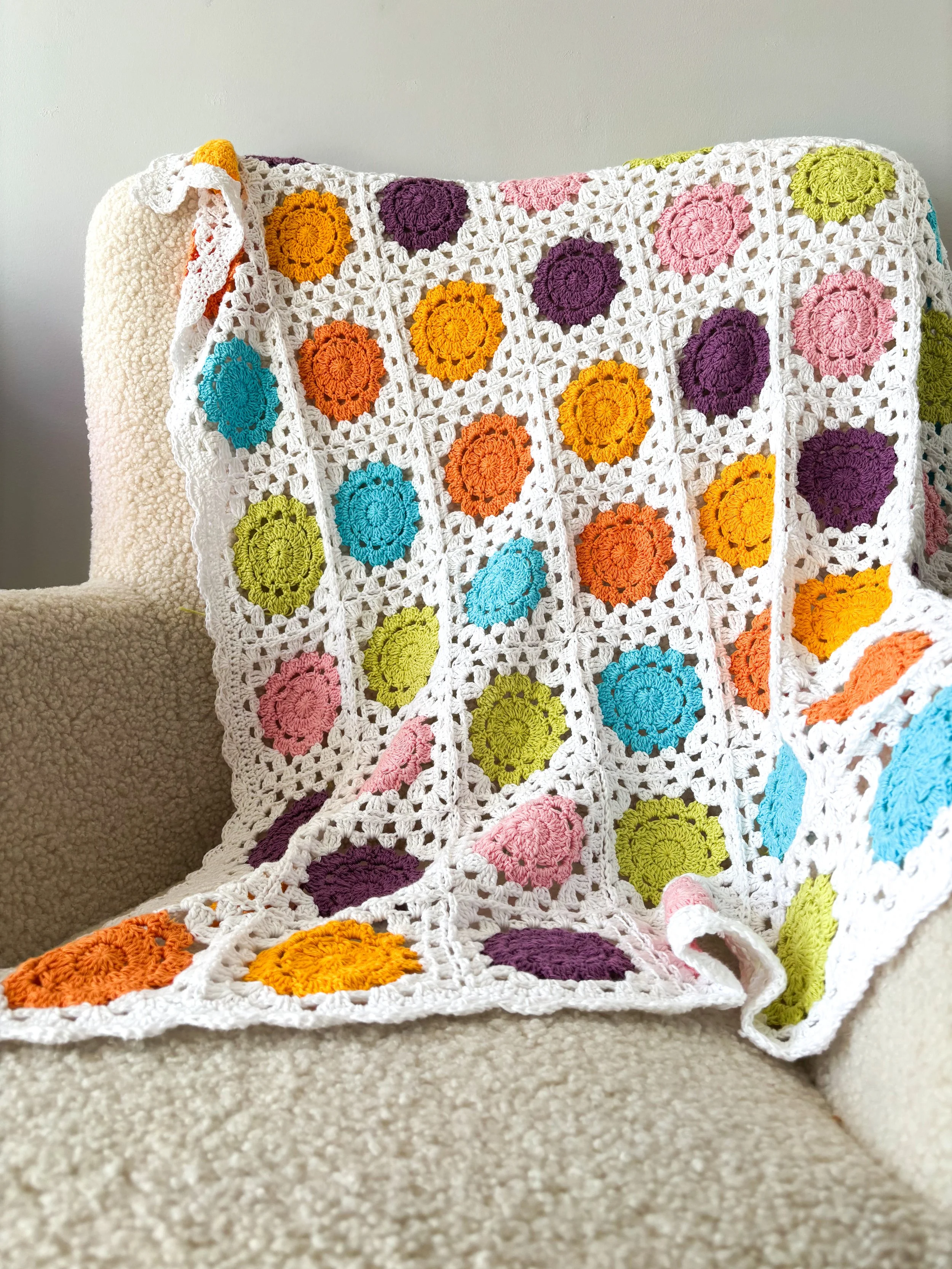 This beginner-friendly crochet pattern is worked up in charming flower squares, each bordered in crisp white for that clean, modern touch. Once joined together, the squares create a stunning grid of color that dances across the blanket, finished with a delicate shell border that adds just the right amount of whimsy.
