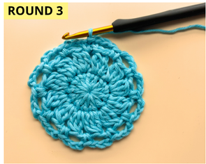 Rnd 3: Move with sl st to next 2ch-sp, 1 ch, 1 sc in same sp, 3 ch, [1 sc in next 2ch-sp, 3 ch] repeat the steps between [...] 11 times, sl st to 1st sc to close the rnd. 12 sc separated by 3 ch.
